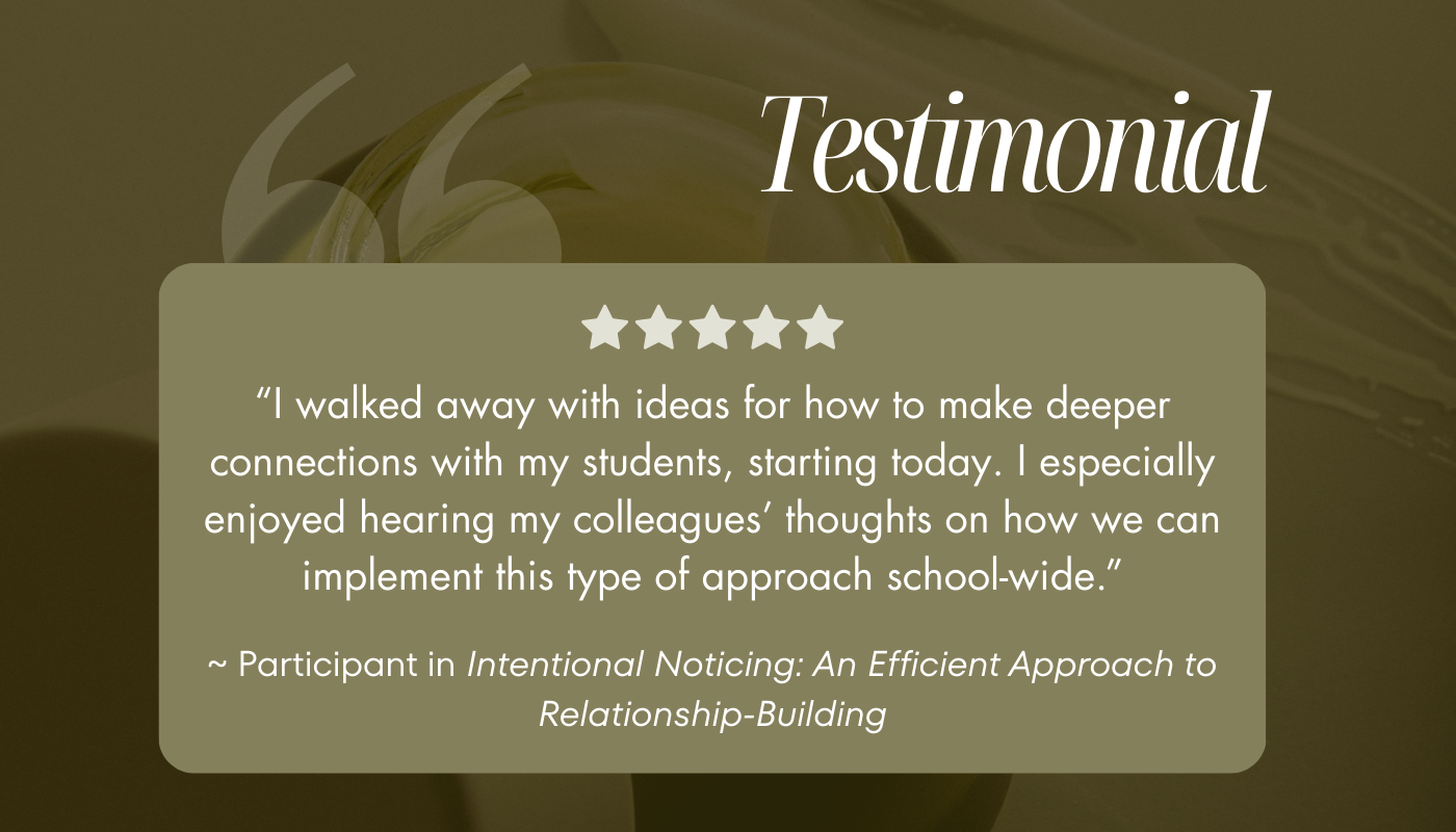 Our workshops are facilitated in an engaging, collaborative style that gives educators time and space to process, dialogue, and take practical next steps. Every participant walks away with strategies they can implement immediately—paired with encouragement that fuels long-term resilience.
